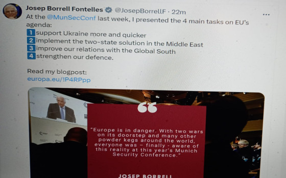 من خلال منشور له على موقع " اكس " تويتر سابقا "  صباح اليوم الاثنين ، اعاد جوزيب بوريل منسق السياسة الخارجية والامنية في الاتحاد الاوروبي التذكير بالنقاط الاربع الاساسية  حول جدول اعمال اتحاد الاوروبي والتي قام بعرضها امام المشاركين في مؤتمر ميونيخ للامن الاسبوع الماضي وهي :