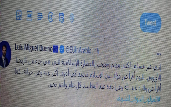 وقال المتحدث في تغريدته " انني غير مسلم لكني مهتم ومعجب بالحضارة الاسلامية التي هي جزء من تاريخنا الاوروبي .. اليوم أقرأ عن مولد نبي الاسلام محمد كي اعرف عنه وعن حياته كما اقرأ عن والده عبدالله وجده عبدالمطلب.. كل عام وانتم بخير "