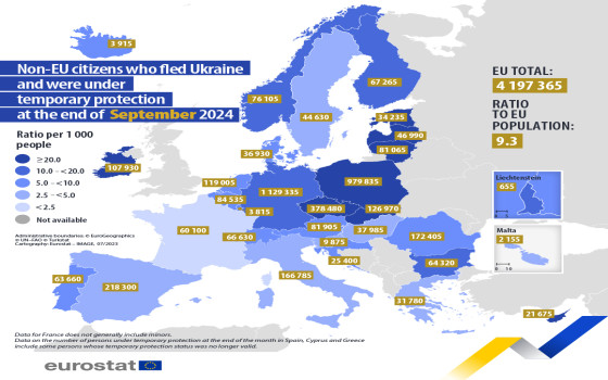 بالمقارنة مع عدد سكان كل دولة من دول الاتحاد الأوروبي، لوحظت أعلى نسبة للمستفيدين من الحماية المؤقتة لكل ألف شخص في نهاية سبتمبر 2024 في جمهورية التشيك (34.7) وليتوانيا (28.1) وبولندا (26.8)، في حين كان الرقم المقابل على مستوى الاتحاد الأوروبي 9.3 لكل ألف شخص.