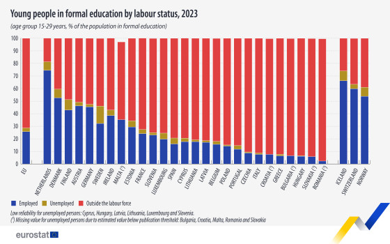 تم توظيف 25.7% من الشباب الأوروبيين (الذين تتراوح أعمارهم بين 15 و29 عامًا) أثناء التعليم الرسمي. وبينما ظل 71.4% خارج قوة العمل، كان 2.9% متاحين للتوظيف ويبحثون بنشاط عن عمل (عاطلون عن العمل) أثناء التعليم الرسمي. وذلك خلال العام الماضي 2023